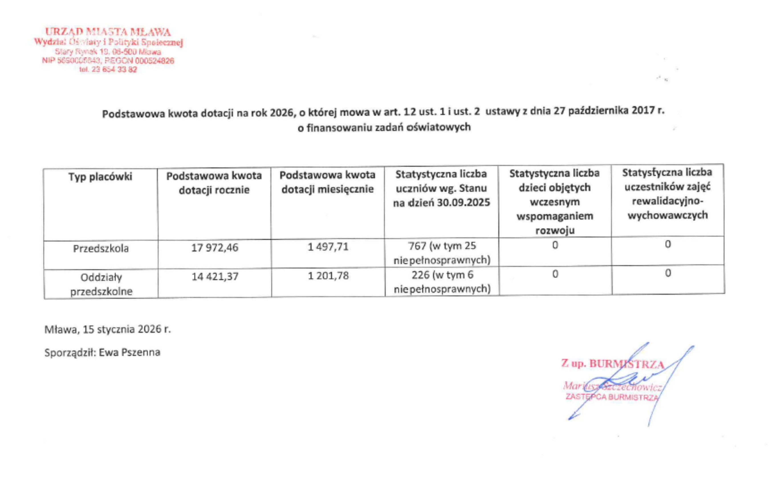 Podstawowa kwota dotacji po aktualizacji na rok 2026 o której mowa w at. 12 ust. 1 ustawy z dnia 27 października 2017 r. o finansowaniu zadań oświatowych | Biuletyn Informacji Publicznej Urzędu Miasta Mława